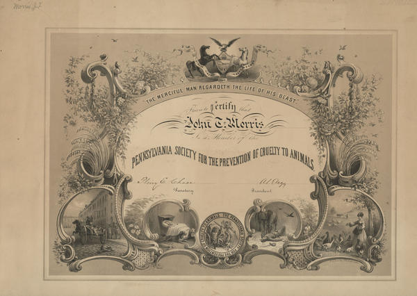 Membership certificate containing four vignettes depicting people interacting with animals. Shows a deer carcuss dropped in the street from the back of a speeding game wagon; a dog lying, on guard, next to a baby sleeping in a cradle; a soldier's horse nuzzling its fallen rider; and a woman feeding seed to fowls in a pasture. Scroll, floral, and horticultural elements border the text and vignettes. Also contains the seal of the society, the Pennsylvania coat of arms, and the motto "The Merciful Man Regardeth the Life of his Beast." Society seal shows an angel raising her hand in protest of a wagon driver beating his work house. The PSPCA was organized by Philadelphia businessman Colonel M. Richards Mucklé in 1867 and incorporated in 1868. It was the second humane society in the country with horse abuse as the organization's initial primary concern.