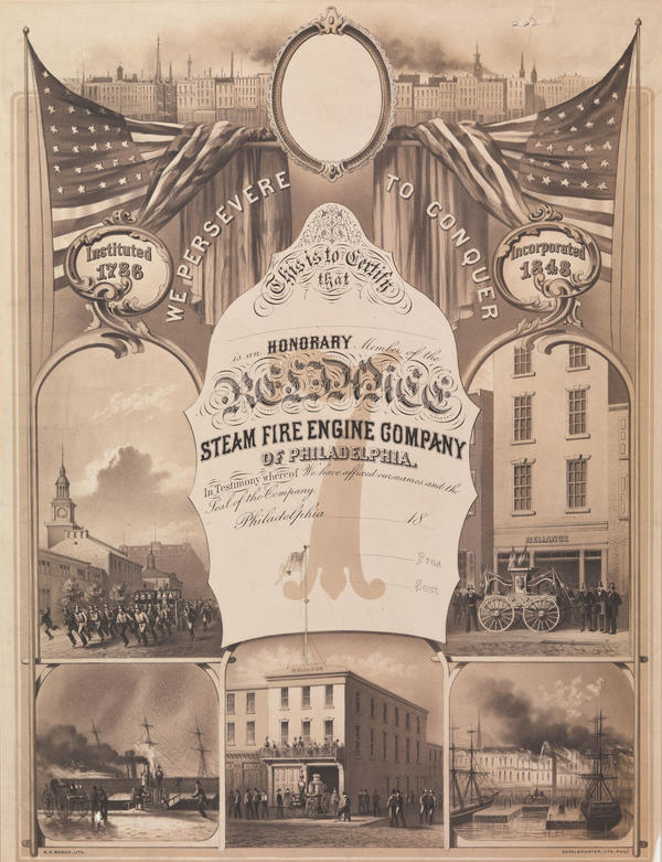 Fire company certificate containing five vignettes showing the company firehouse and engines, and firefighting scenes bordering text framed as a badge. Vignettes depict firefighters gathered around a hand-pump, and a steam engine, at their stations near New and Second streets; firefighters racing an engine past the Public Ledger Building (built 1866-1867) and Independence Hall en route to a fire; and firefighters using a steam engine to battle a fire aboard a sailing vessel, and a hand pump to battle a fire at buildings opposite piers at the Delaware River. Also contains above the vignettes two American flags draped over a pole; a panoramic view of cityscape; an empty framed oval, probably to be used for a photographic portrait of the fire fighter member; two oval frames surrounding the company's institution and incorporation date, 1786 and 1848 respectively; and the company motto "We Persevere to Conquer." Company originally established by Quakers.