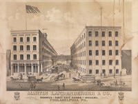 Around the corner of the newer building inscribed with the date the business was established, a man leads a bridled horse past a wood bin. Birds fly above the building adorned with a weather vane decorated with a sheep. Also contains two vignettes of the company seal printed below the image. Seal includes a crown and two eagles. Landenberger & Co. was the only Philadelphia factory in the late 1850s to produce hosiery, opera hoods, comforters, shawls, and scarves. The factory expanded in 1870 as a result of the massive increase in sales of hosiery and blankets spurred by the Civil War. Landenberger sold the properties in 1882 but continued as tenant at 1101-1103 Frankford Avenue until 1886.