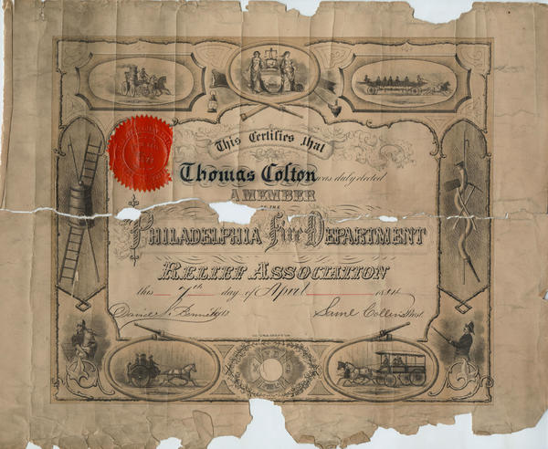 Certificate containing four vignettes depicting a variety of horse-drawn fire engines and fire fighting vehicles. Vignettes include a steam engine, hook and ladder truck, and ambulance. Bundles of firefighting equipment, including a hose, ladder, fire hydrant, hooks, and ax, flank each side of the text. The seal of the city of Philadelphia bordered by fire helmets and lanterns and the seal of the Fire Department appears at the top and bottom, respectively. A twisting fire hose divides pictorial elements. Each lower corner contains a fire fighter at work. Lower left figure rescues a bare-chested person and the lower right figure uses a hose. The association was established on June 14, 1873.