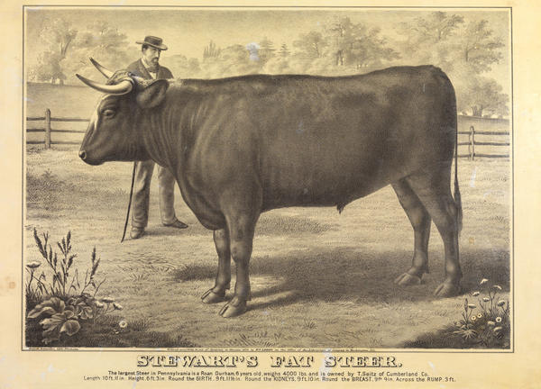 Stewart's fat steer. [graphic] : The largest steer in Pennsylvania is a Roan Durham, 6 years old, weighs 4000 lbs. and is owned by T. Seitz of Cumberland Co. Length. 10ft 11 in. Height 6 ft. 3 in. Round the girth. 9 ft. 11 1/2 in. Round the kidneys, 9 ft. 10 in. round the breast, 9 ft. 9 in. Across the rump, 3 ft. / P.