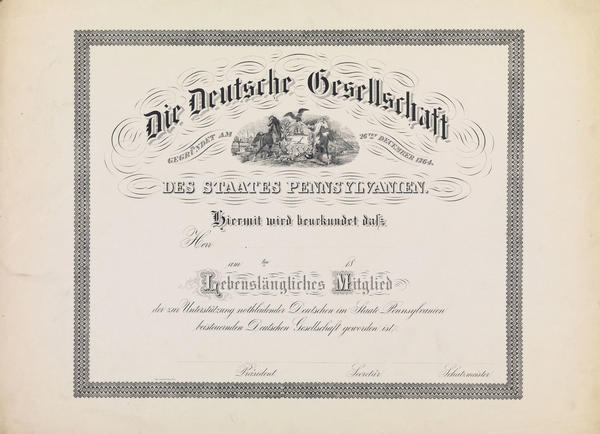 Membership certificate for the German Society of Pennsylvania, the oldest organization of its kind in the United States. Contains a vignette showing the Pennsylvania coat of arms, and an ornamental border.