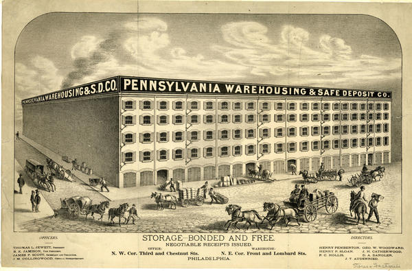 Pennsylvania Warehousing & Safe Deposit Co. [graphic] : Storage - bonded and free. Negotiable receipts issued. Office: N. W. Cor. Third and Chestnut Sts. Warehouse: N. E. cor. Front and Lombard Sts. Philadelphia.