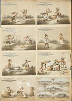 Series of tradecards advertising the lithographic firm established as Craig, Butt & Finley in 1869 and renamed Craig, Finley & Co. in 1872. Seven of the tradecards depict quaint scenes of children at play and work in addition to one containing a montage of vignette views of buildings at the Centennial Exhibition of 1876. Scenes include a boy presenting flowers to a girl, children witnessing breaking and broken wares, children chasing a rabbit, a shepherd boy with a lamb, and girls performing the wash. All the boys are attired in knickers and most wear hats. Most of the girls are attired in peasant-like dresses. Centennial tradecard shows Machinery Hall, the Main Building, Art Gallery, Agricultural Hall, and Horticultural Hall. Also includes the promotional text: Publishers of this style Centennial Card. Firm operated until 1950.