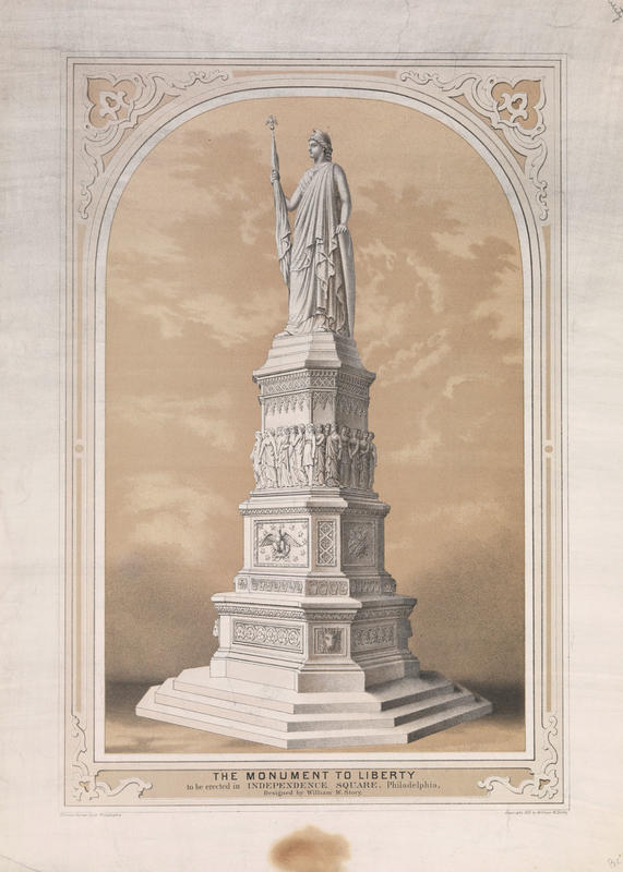 View showing an unexecuted monument commissioned by the citizen's group National Commemoration Monument Association and designed by sculptor William Wetmore Story for the re-landscaping of the square for the Centennial celebration of 1876. Shows the figure of Liberty standing upon a column adorned with female allegorical figures; an eagle encircled by stars; fearsome animal heads; and floral ornaments. The monument was to be placed in the center of the square at the intersection of the main paths. In 1876, the committee asked to and was allowed to be released from a city ordinance, passed in March 1875, that required them to raise $50,000 for the erection of the monument and the project effort apparently dissolved.
