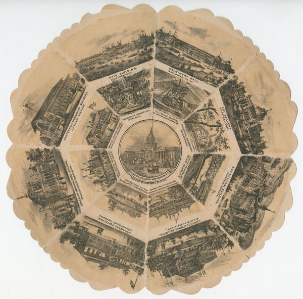 Souvenir shaped as a rose when opened and containing 30 vignette views of prominent buildings, landmarks, and iconography
