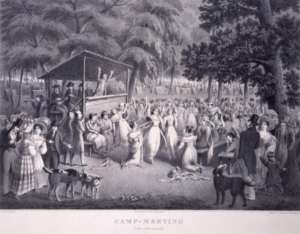 Religious view showing a backwoods revivalist meeting, probably near Philadelphia. On a rickety covered wood stage used as an altar, a minister enthusiastically preaches, his hands in the air, to a crowd of followers. Four men, two distracted by a nearby horn blower, sit on a bench, on the stage, behind the preacher. The followers, predominately women, kneel, dance, stand, and raise their hands with the spirit in an opening between benches. Others, including an older woman and a mother with child, remain seated on the benches as one man holds a fainting woman and another with a euphoric look leans on a tree. Onlookers, many elegantly-dressed, surround the camp meeting attendees. A few look with repugnance and point while others converse in seeming obliviousness. Also shows, in the foreground, three dogs, two wearing collars. One sniffs another's face in greeting. In the distant background, among clearings in trees, the tents and wagons of the attendees are visible. Camp meetings were usually conducted by Methodists in the early 19th century.