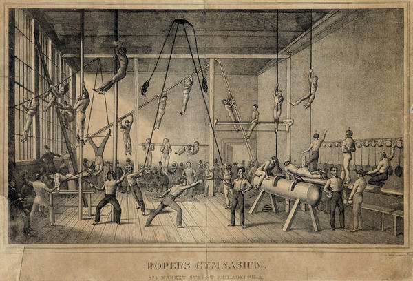 Advertisement showing the interior of the well-attended gymnasium, operated by James Roper on the 800 block of Market Street, in which several men exercise in front of a crowd of spectators. In the right, three men perform balance moves on a balance beam next to a wall adorned with a rack from which boxing gloves and squash rackets hang. Beside the beam, two men wearing boxing gloves converse near the pommel horse that two men utilize. In the front center and left of the room, two pairs of men, one pair wearing face guards, fence; two men pull weights attached to the ceiling; and another tests his strength on the parallel bars near men climbing poles. To the rear, other exercisers climb vertical and inclined ropes, hang and climb from exercise ladders, straddle and perform pull-ups on horizontal poles, and dangle upside down from a trapeze. Around the room, spectators including several men and a few women in winter clothing, stand and sit to watch the gym attendees. Roper established the gymnasium circa 1831 which relocated to the 800 block of Walnut Street circa 1833.