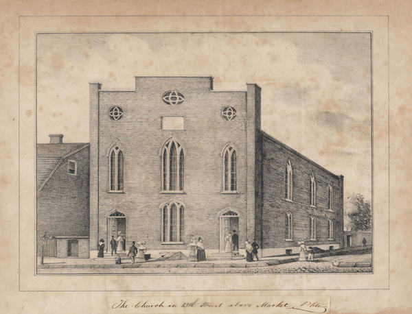Exterior view of the front facade and flank of the Ninth Presbyterian Church showing well-dressed men, women and children entering the left and right entrances. The church, adorned with Gothic arched windows and details, was built circa 1815 on North Thirteenth Street with funds donated by Margaret Duncan to serve the poor and working class of Philadelphia. Originally named the Second Associate Reformed Church, the church was also commonly known as Margaret Duncan's Church or the Vow Church. Controversy over John Chambers appointment as a new minister of the church in the mid 1820s influenced his decision to form a new congregation with his supporters in 1830. They moved to the much larger First Independent Church at Broad and Sansom Streets. This lithograph may have been created to commemorate the installation of a new minister at the Thirteenth Street church in 1832.