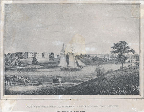 View of the Blockley Almshouse on the west side of the Schuylkill River. Designed by Philadelphia architect William Strickland and constructed 1833. View shows the riverbanks where two men fish and cows graze. A two-masted sailing ship passes on the river. Cityscape on the east bank of the river and the Market Street Bridge are visible in the right background.