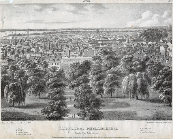 Plate 4 of four panoramas originally issued as Panorama of Philadelphia. Views taken from the State House steeple (Philadelphia: