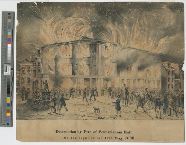 Exterior view of Pennsylvania Hall engulfed in flames. A large crowd looks on. Fire fighters spray water on an adjoining building. Pennsylvania Hall was constructed 1837-1838 at Sixth and Haines Streets in Philadelphia as a meeting place for local abolitionist groups. Dedication ceremonies began on May 14, 1838 and continued over several days in a climate of growing hostility. On the night of May 17, 1838, a mob stormed the Hall and set it on fire. Fire companies refused to fight the blaze, and the building was completely destroyed. Bowen issued this print commemorating the event within a few days of the fire.