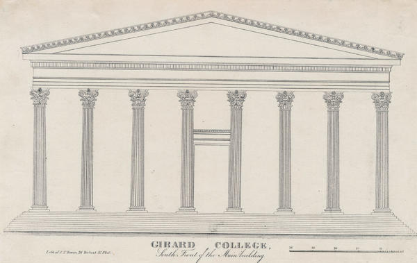 South front elevation of Founder's Hall, Girard College located between Girard and Ridge Avenues at Corinthian Avenue in Philadelphia. Designed by Philadelphia architect Thomas Ustick Walter in the Greek Revival style, the hall was constructed 1833-1847. Girard College was established through a bequest from Stephen Girard, a Philadelphia financier and philanthropist, for the creation of a school for poor white male orphans.