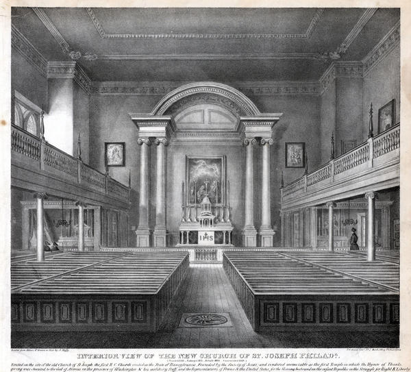 Interior view of the new church of St. Joseph Philada. (Founded 1733 - Enlarged 1821 - Rebuilt 1838 - Consecrated 1839.) [graphic] : Erected on the site of the old Church of St. Joseph, the first R. C. Church erected in the State of Pennsylvania. Founded by the Society of Jesus and rendered memorable as the first temple in which the Hymn of Thanksgiving was chanted to the God of armies in the presence of Washington & his military staff and the representatives of France & the United States, for the blessing bestowed on the infant Republic in the struggle for right & liberty. Painted from nature & drawn on stone by A. Hoffy.