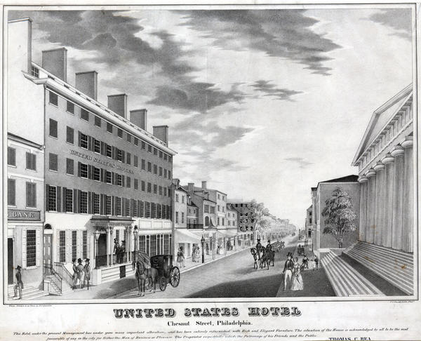 United States Hotel Chesnut [sic] Street, Philadelphia. [graphic] : This hotel under the presant [sic] management has under gone many important alterations and has been entirely refurnished with rich and elegant furniture. The situation of the house is acknowledged by all to be the most favourable of any in the city for either the man of business of pleasure. The proprietor respectfully solicits the patronage of friends and the public. Thomas C. Rea / From nature & on stone by D. S. Quintin.