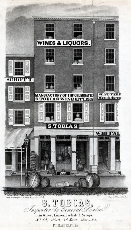 Advertisement showing the four-story storefront adorned with signage on the 100 block of North Third Street. A patron enters one of the two open entryways at which a straw basket and wine cask are displayed across from a large-cask shaped sign. Sign reads "S. Tobias No. 68 Importer & Dealer in Wines Liquors Cordials and Syrups." At the other entryway, a laborer rolls a cask out the door near a worker entering the cellar. Within the store, the backs of a patron and a clerk are visible in the rear of the store in which shelves of liquor bottles, straw baskets, wine casks, and barrels are displayed on shelves, the floor, and the open display window. Other boxes, bottles, casks, and barrels are visible at the upper floor windows. Barrels and boxes, one marked "S. Tobias" line the sidewalk, near a street lamp in front of the store. Also shows partial views of the adjacent businesses and the signage adorning the storefronts of Charles M. Schott, dry goods (66 N. 3rd St.) and Scattergood & Whitall, druggists' glassware (70 N. 3rd St.). A clerk is visible working at a table through the doorway of Schott, and a pulley and boxes are visible within the open doorway of Scattergood & Whitall. Tobias tenanted the site starting in 1845 and renamed his business Soloman Tobias & Son in 1847.