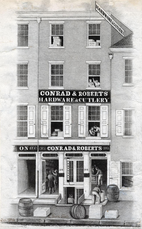 Advertisement showing the four-story storefront adorned with signage on the 200 block of North Third Street. The store interior is visible through the two open entrances. A clerk retrieves merchandise from a shelf for a patron and another serves a gentleman at a counter. Laborers move barrels and boxes from the open cellar. Above the cellar, a "Hardware" sign is displayed in front of the store window. At the upper windows, employees work and boxes, crates, and barrels are stacked. Also shows crates and barrels (marked with illegible text) lining the sidewalk and partial views of adjacent buildings, including a part of the store sign on 125 N. Third Street. Conrad and Roberts began operating from the address in 1845.