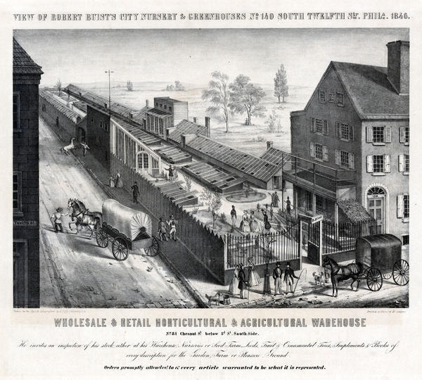View of Robert Buist's city nursery & greenhouses No. 140 South Twelfth Str. Phila. 1846. [graphic] / Wholesale & retail horticultural & agricultural warehouse No. 84 Chesnut [sic] St. below 3d. St. south side. We invites an inspection of his stock either at his warehouse nurseries or seed farm. Seeds, fruit & ornamental trees, implements & books of every description for the garden, farm or pleasure ground. Orders promptly attended to & every article warranted to be what is represented. Taken on the spot & lithographed by A. Hoffy, Philadelphia.