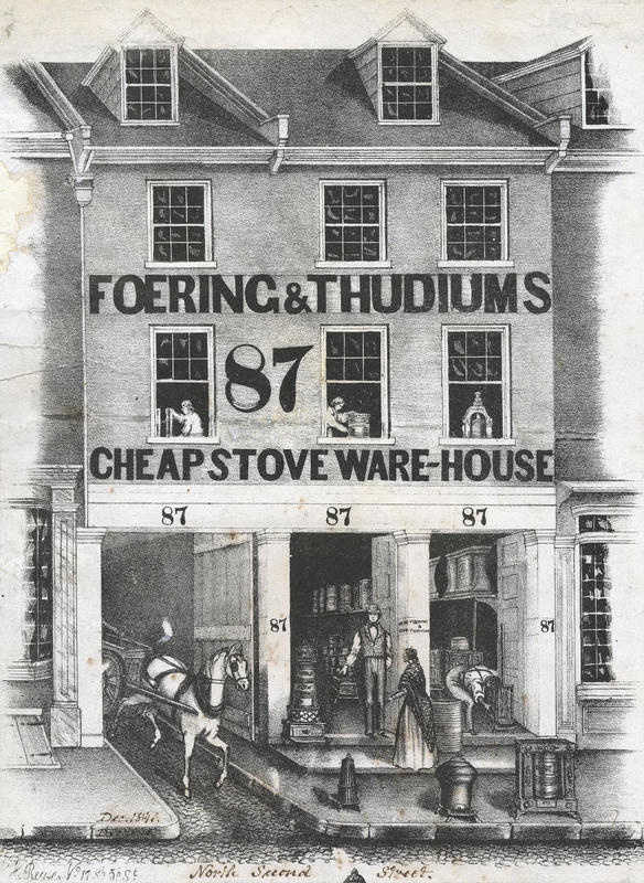 Advertisement depicting the three-and-a-half story warehouse operated by Frederick Foering and C.A. Thudium at 87 North Second Street. In the open entranceways, a white man clerk assists a white woman shopper and an African American laborer lifts a stove. Displays of stoves line the sidewalk and the store walls. On the second floor near open windows, white laborers work. A horse-drawn cart departs an adjoining exitway. Foering and Thudium, one of the city's first domestic stove manufacturers, started in business in 1828, and operated on North Second Street from 1845 until 1847.