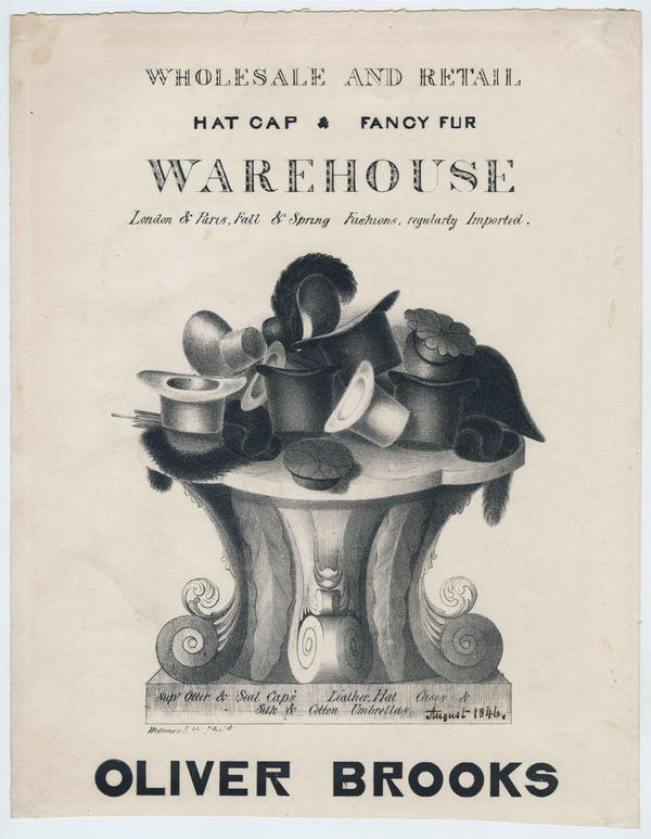Oliver Brooks, wholesale and retail, hat, cap & fancy fur warehouse [graphic] : London & Paris. Fall & spring fashions, regularly imported. Superior otter & seal caps. Leather hat cases & silk & cotton umbrellas.