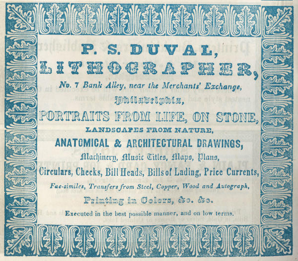 P.S. Duval, lithographer, no. 7 Bank Alley, near the Merchant's Exchange, Philadelphia, [graphic] : Portraits from life, on stone, landscapes from nature, anatomical & architectural drawings, machinery, music titles, maps, plans, circulars, checks, bill heads, bills of lading, price currents, fac-similes, transfers from steel, copper, wood, and autographs, printing in colors, &c &c. Executed in the best possible manner, and on low terms.