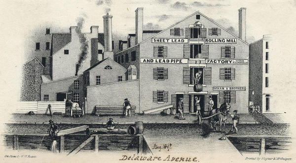 Advertisement showing the factory complex at 608 Delaware Avenue (occupied 1844) for the lead pipe manufactory established in 1841 by George N., Henry B., and William P. Tatham. Factory employees work in front of and at the wharf of the industrial building that is covered with signage. Men lift a barrel with a hoist; guide horse-drawn drays into a courtyard, down an alley, and to be unloaded; move planks of wood; and spray a hose into the river. Also shows partial views of surrounding buildings. Tatham & Brothers, a firm established in New York in 1838, operated the Philadelphia branch from the address until circa 1867. The firm patented a hydraulic pressure method to produce pipe in 1841.