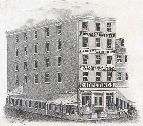 Advertisement showing the five-story storefront of the carpet warehouse, covered in signage, at 269 Market, i.e., Seventh and Market streets. Patrons enter the doorways past rolled carpets on display. In front of the store, more rolled carpets rest on crates, a boy leans on a street lamp at the corner, and a partially visible horse-drawn wagon is parked. Pedestrians walk on Seventh Street past the side of the store and under awnings printed with illegible text. Also includes a dog and partial views of the adjacent business and a horse-drawn carriage traveling in the street. Banister operated from 269 Market Street 1845-1852.