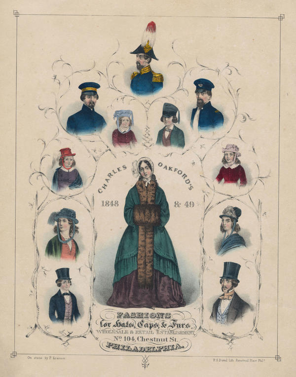 Advertisement for the hat manufacturer containing a full-length portrait of a young woman wearing a hat and fur accessories surrounded by 11 bust portraits showing men, women and children in a variety of hats. Most of the women's and girl's hats contains ribbons, bows, and feathers. Oakford established his business in 1827 and located to 104 Chestnut in 1843 where he began his wholesale trade in 1850. He operated from the address until 1852.