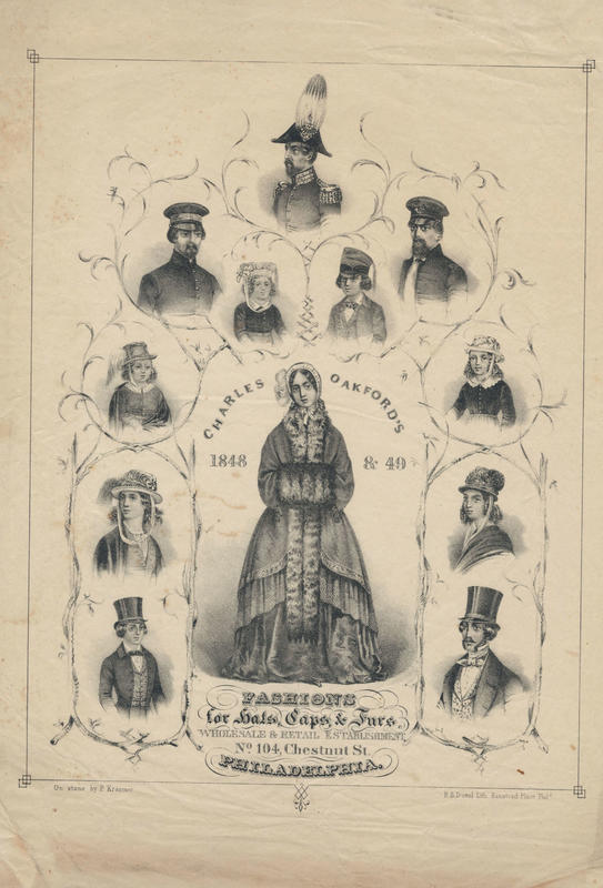 Advertisement for the hat manufacturer containing a full-length portrait of a young woman wearing a hat and fur accessories surrounded by 11 bust portraits showing men, women and children in a variety of hats. Most of the women's and girl's hats contains ribbons, bows, and feathers. Oakford established his business in 1827 and located to 104 Chestnut in 1843 where he began his wholesale trade in 1850. He operated from the address until 1852.