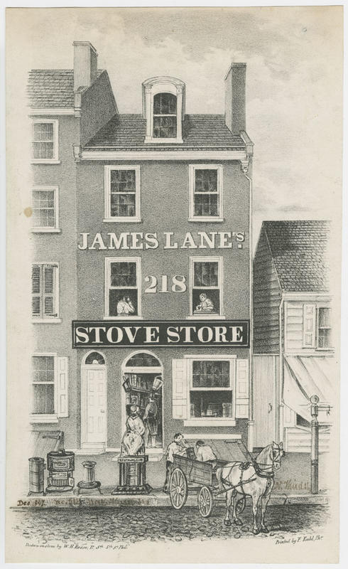 [James Lane's stove store, No. 218 North Third Street, Philadelphia] [graphic] / Drawn on stone by W. H. Rease, 17, Sth. 5th St. Phil.