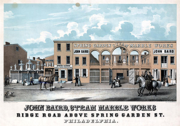 Advertisement containing an exterior view showing the Ridge Road entrance to the "John Baird," "Spring Garden Marble Mantle Manufactory" and "Steam Marble Works" erected in 1846. Works include a central courtyard, offices, and adjoining yard marked "Garden Statuary, Vases, Ornamental Sculpture, &c." that contains a variety of fountains, vases, and statues on the platform roof. A cupola adorns a rear building of the factory. In front of the courtyards, gravestones are displayed and workers move large slabs of marble with a lever and by dolly. On the roof of the central courtyard, a clerk shows patrons a selection of monuments. In front of the factory, couples promenade on the sidewalk, a horse is hitched, a couple rides on horseback and dogs greet each other in the street. The woman rides side-saddle. Also shows employees within the courtyard, office windows, and visible through an open entryway climbing a flight of stairs. Baird established his business in 1841 gaining a reputation as a vanguard in the modern operations of marble works.