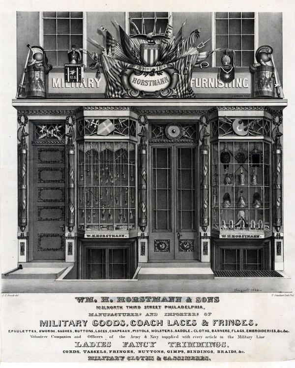 Wm. H. Horstmann & Sons No. 51, North Third Street Philadelphia, manufacturers and importers of military goods, coach laces, & fringes, epaulettes, swords, sashes, buttons, laces, chapeaux, pistols, holsters, saddle-cloths, banners, flags, embroideries, &c. &c. Volunteer companies and officers of the Army & Navy supplied with every article in the military line, ladies fancy trimmings, cords, tassels, fringes, buttons, gimps, bindings, braids, &c. Military cloths & cassimeres. [graphic] / J. T. French, del.