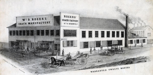 Advertisement showing the two-story factory adorned with signage on the 800 block of North Sixth Street near Spring Garden. A boy pulls a carriage out of one of the two entries to the building (Sixth Street) as patrons inspect a different model of coach being pushed out by a factory worker at the other. A family walks between the coaches and other carriages are visible inside. Around the corner (Brown Street), on the sidewalk, two gentlemen converse and a couple peers into a factory window. Near the rear of the factory, a laborer transports a sack on his back near a strolling couple past a hackney displayed on a one-story addition. In the street, a driver tries to reign in his speeding carriage occupied by a couple that is being chased by a barking dog as a boy works on the wheel of a factory carriage nearby. A pedestrian watches the scene from the corner. Also shows hitching posts lining the sidewalks and a smaller factory with several smokestacks in the right background. Rogers operated from the site 1846-1854.