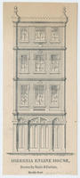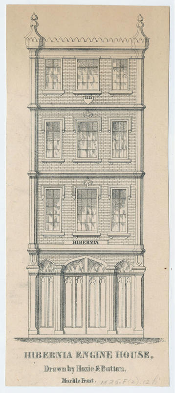 Front elevation of the proposed marble fronted fire station for the Hibernia Engine Company. Building adorned with lettering "Hibernia" above the frieze and date marker "1752" (i.e., the founding date of the volunteer company).