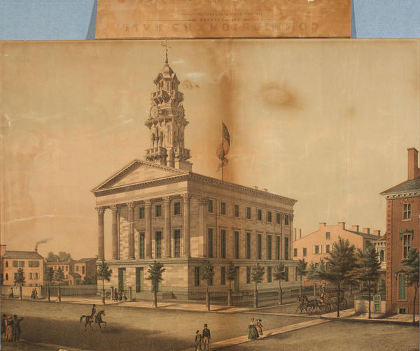 Exterior view of the hall containing the district's police station and Mayor's office completed in 1848 after the designs of William L. Johnston at Spring Garden and North Thirteenth streets. Shows the Greek-Revival style building, the largest of the commissioners' halls buildings, adorned with an American flag and including a steeple built by Jacob Berger with a clock made by T. Tyson. Also shows street and pedestrian traffic, including strolling couples, a man on horseback, and a horse-drawn street car. Prior to the city's consolidation with bordering townships in 1854, neighborhoods maintained and housed their own police stations, mayors, and other government officials in commissioners' halls, including Spring Garden. Razed circa 1892.