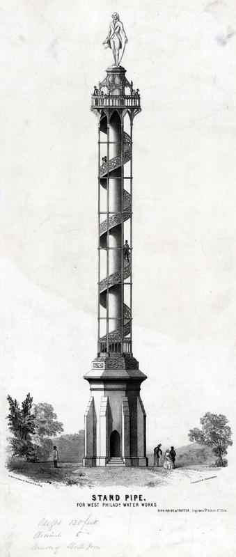 View showing the proposed design for a standpipe with an ornate spiral staircase and statute of George Washington to be erected at Thirty-Fifth and Sycamore streets as part of the Twenty Fourth Ward Water Works (i.e., West Philadelphia Water Works). Individuals gaze up at the stucture from its base as other men and women ascend the staircase and view the vista from the observation deck. Completed circa 1855, without the statue, after the designs of engineers Birkinbine & Trotter, the standpipe served as a reservoir for the waterworks located on the west bank of the Schuylkill River above the Fairmount Dam. The standpipe was removed in 1870.