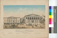 Street scene showing south side of Chestnut Street between 4th and 5th Streets depicting two bank buildings designed by Philadelphia architect William Strickland: the Philadelphia Bank building (built 1836) and the custom house (formerly the Second Bank of the U.S., built 1818-24). Philadelphia Bank building (400-408 Chestnut, after renumbering) houses and includes signage for the Western Bank and Girard Life & Trust Company, as well as H.S. & C. Ogden, tailors; Kelly & Bright, stationers; Edward Borheck, optician; Martin Leans, engraver; Wilcox & Delleker, custom house brokers; and Wm. H. Patton, dealer in decorative wall papers. Street scene includes a vendor, two coaches, a man on horseback, and pedestrians.