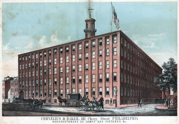 Advertisement showing the multi-story factory on the 800 block of Cherry Street. A tower and American flag adorn the building in which workers are visible at a number of the open windows. At the far left end of the building, a wagon travels near a man carrying a basket and through an archway to the courtyard. A horse-drawn wagon is parked near the main entrance of the factory. The entry contains the name of the firm and a small stoop adorned with iron work. At the corner, a boy with a light fixture walks past a lamppost, as in the street, a horse-drawn wagon travels behind a carriage occupied by three gentlemen. The vehicle is drawn by two agitated horses that the driver attempts to settle. At the east side of the building, two gentlemen converse and another horse-drawn wagon drives down the street. Also shows a woman strolling past a tree at the adjacent corner, and neighboring buildings. Cornelius & Baker was founded in 1835 and operated 2 factories and a storefront by the 1850s. The firm was succeeded by Cornelius & Sons in 1869.
