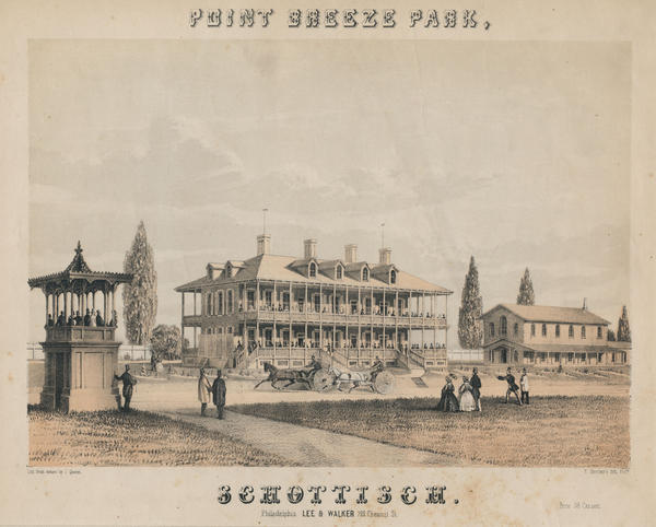 Cover illustration is a lithograph, tinted with two stones, showing several spectators at a trotting race at the park on the Penrose Ferry Bridge Road near Point Breeze. In the right, several men, in top hats, stand in the judge's stand while male and female club members mob the piazzas of the two-story main clubhouse as the two trotters pulling sulkies race past on the course. A few spectators stand on the grounds and landscaped paths. Also shows a second smaller clubhouse building. The park, established in 1855 by the Point Breeze Park Association of sportsmen, promoted trotting races as agricultural exhibitions to circumvent an 1817 city ban of horse racing. The park was sold to a private owner in 1901 and later sold for an amusement park in 1912.