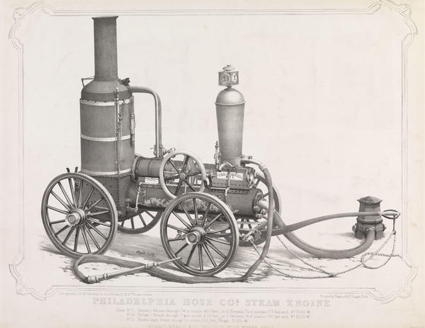 Philadelphia Hose Cos. steam engine [graphic] : Class no. 1. Throws 1 stream through 1 1/4 in. nozzle 210 feet_ or 2 streams, 7/8 in. nozzles, 175 feet each, wt 7,000 [lbs]. [Class] No. 2. Throws 1 stream through 1 1/8 in. nozzle 200 ft_ or 3 streams, 3/4 in. nozzles, 160 feet each, wt. 6,000 [lbs]. [Class] No. 3. Throws single stream through 1 in. nozzle, 200 feet, weight 5,000 [lbs]. Reaney, Neafie & Co. builders, Penn Works, Phila.; Printed by Wagner & McGuigan.
