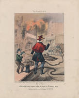 One of a series of satires mocking the ineptitude of Philadelphia volunteer firefighters. Shows a volunteer, in full uniform, spraying a boy bystander in the face, instead of a crumbling, burning building, with a fire hose. The fire hose is attached to a hand-pumper visible in the background. Also shows fire debris, a hose attached to a hydrant, other fire fighters attending the fire engine, and the storefront of "F. Adams."
