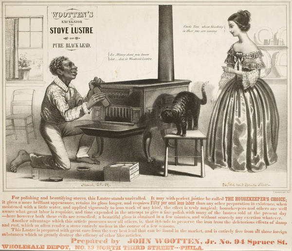 Racist advertisement promoting Wootten’s Excelsior Stove Lustre and depicting an African American man, portrayed in caricature,