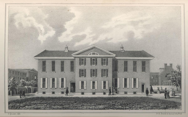 View showing the side elevation of the large brick building, Race Street Meeting House, built circa 1856 to house the meeting, later known as Friends' Central Meeting (Hicksite) at the southwest corner of Fifteenth and Race Streets (1520 Race Street), extending to Cherry Street (1501 Cherry Street). Friends enter the building and walk on the paths surrounding a lawn in the foreground. The building, the second meeting house for the Hicksites (separation in 1827), was built in response to the women's meeting's request for a larger and safer meeting space than the first Hicksite meetinghouse at Fifth and Cherry streets. The Race Street side of the building was used by the monthly meeting and the Cherry Street side by the Yearly Meeting. Race Street was the site of the Hicksite Philadelphia Yearly Meeting between 1857 and 1955.