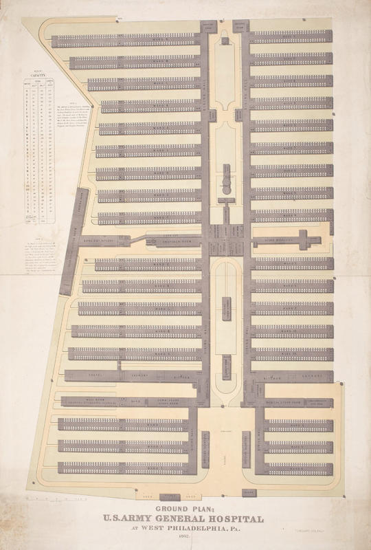 Ground plan of the H-shaped Satterlee U. S. General Hospital in West Philadelphia, showing 32 wards lettered A-Z; XX; OK;