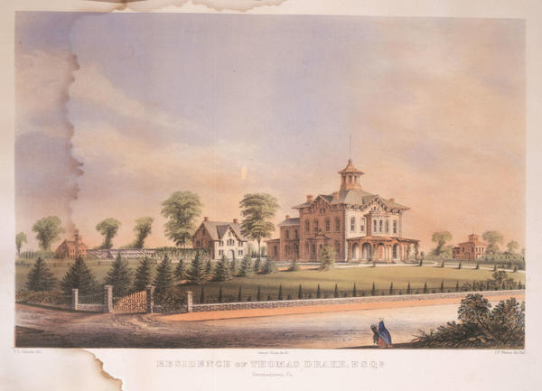 View of grounds, outbuildings, and residence of Thomas Drake. Drake moved into this Italianate house, designed by the well-known Philadelphia architect, Samuel Sloan, about 1863. The house reportedly cost $55,000. Thomas Drake earned his fortune through the manufacture of cotton and woolen goods, and investments in real estate and coal stocks.