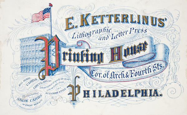 E. Ketterlinus' lithographic and letter press printing house cor. of Arch & Fourth Sts. Philadelphia. [graphic] : Bill heads, cards, circulars, &c. lithographed at nearly the same cost as letter press in a superior style. Illuminated show cards in great variety.