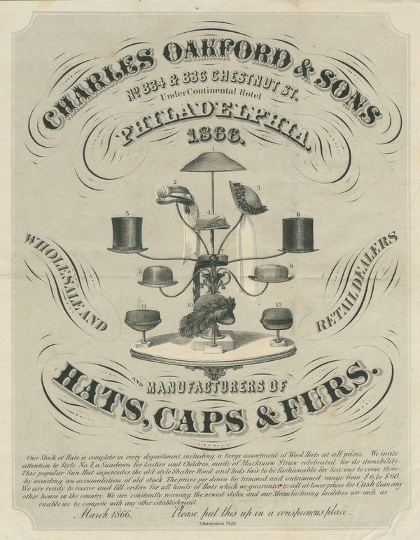 Charles Oakford & Sons, No. 834 & 836 Chestnut St., Philadelphia. 1866. Wholesale and retail dealers and manufacturers of hats, caps & furs. [graphic] : Our stock of hats is complete in every department including a large assortment of wool hats at all prices. We invite attention to style no. 1, a sundown for ladies and children, made of mackinaw straw celebrated for its durability. This popular sun hat supercedes the old style shaker hood and bids fair to be fashionable for seasons to come thereby avoiding an accumulation of old stock. The prices per dozen for trimmed and untrimmed range from $6 to $60. We are ready to receive and fill orders for all kinds of hats which we guarantee to sell at lower prices for cash than any other house in the country. We are constantly receiving the newest styles and our manufactory facilities are such as enable us to compete with any other establishment. March 1866. Please put this up in a conspicuous place.