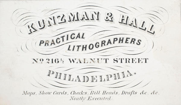 Kunzman & Hall, practical lithographers, no. 216 1/2 Walnut Street Philadelphia. [graphic] : Maps, show cards, checks, bill heads, drafts &c. &c. Neatly executed.