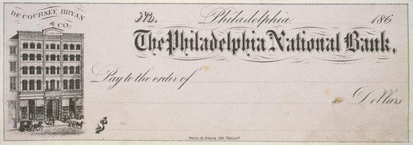 Vignette illustrating a banknote for the Philadelphia National Bank. Shows the importer and manufacturer of men's furnishing goods (618) in Artisan Hall at 616-620 Chestnut Street. Patrons enter the storefronts and pedestrians walk on the sidewalk near a horse-drawn dray parked in the street to be loaded. A horse-drawn carriage travels nearby. De Coursey, Bryan & Co. was active 1867-1868.
