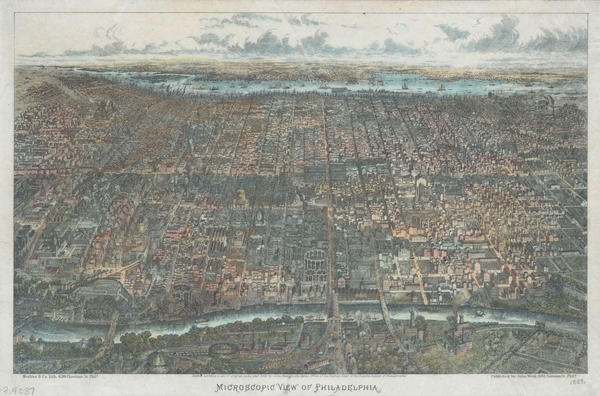 Bird's eye view predominately showing the built city from the Schuylkill to the Delaware rivers and Port Richmond to South